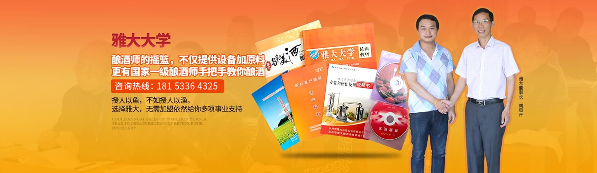 永州市雅大科技實業(yè)有限公司成立于1999年,位于湖南省南部國家歷史文化名城—永州市,是一家集釀酒技術(shù)研究、釀酒設(shè)備、釀酒酒曲生產(chǎn)銷售于一體的國家高新技術(shù)企業(yè)。擁有標(biāo)準(zhǔn)房、科技培訓(xùn)樓13500m7,公司連續(xù)十年被省、市江商局評為重合同守信用單位,榮獲201 7年中國釀酒設(shè)備行業(yè)新標(biāo)桿企業(yè)獎。可提供釀酒項目整體解決方案,包括釀酒項目選擇、酒廠規(guī)劃設(shè)計、釀酒技術(shù)培訓(xùn),酒類產(chǎn)品設(shè)計、包裝瓶(盒)設(shè)計、酒品營銷策劃、協(xié)助辦理資質(zhì)、編制可行性報告等方面。
